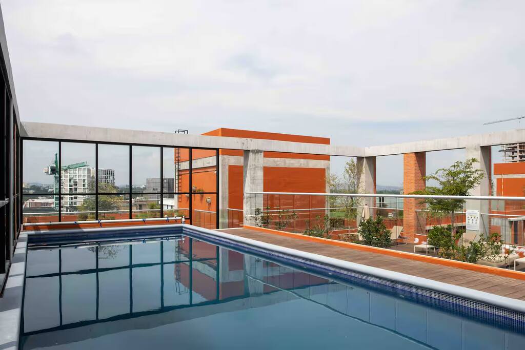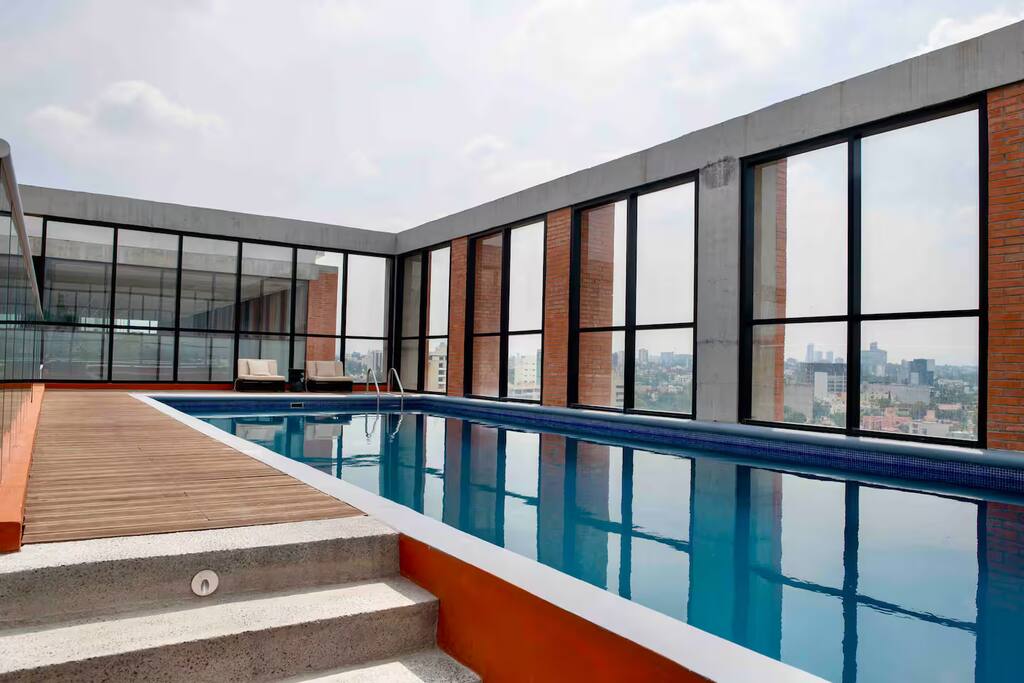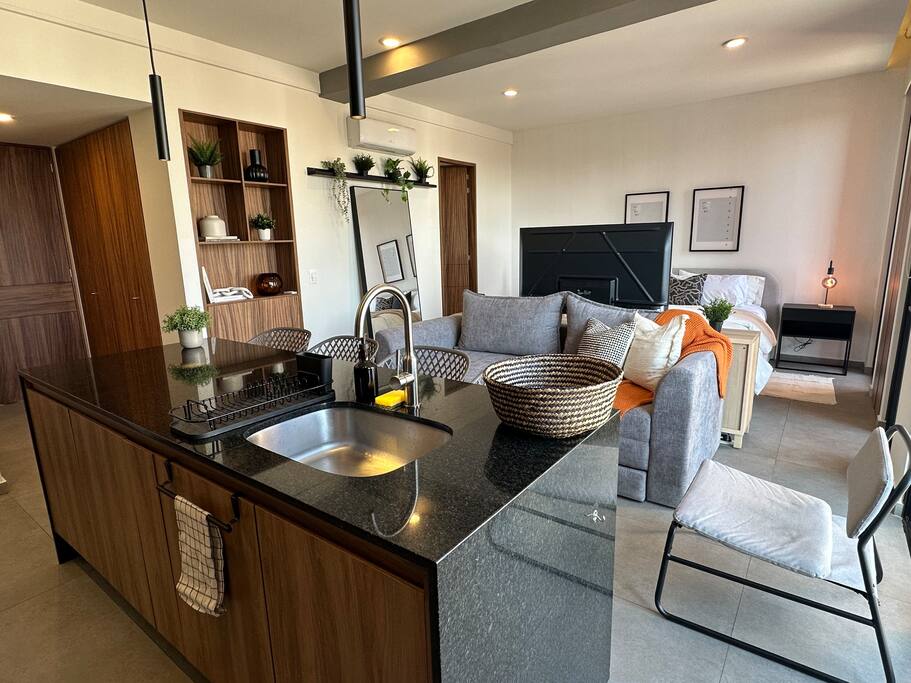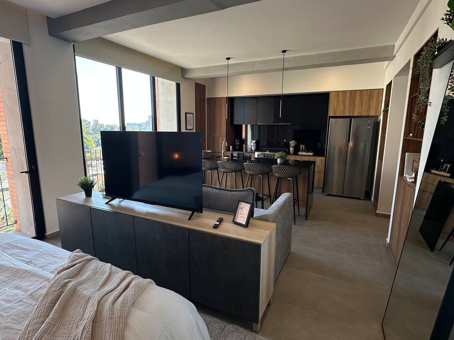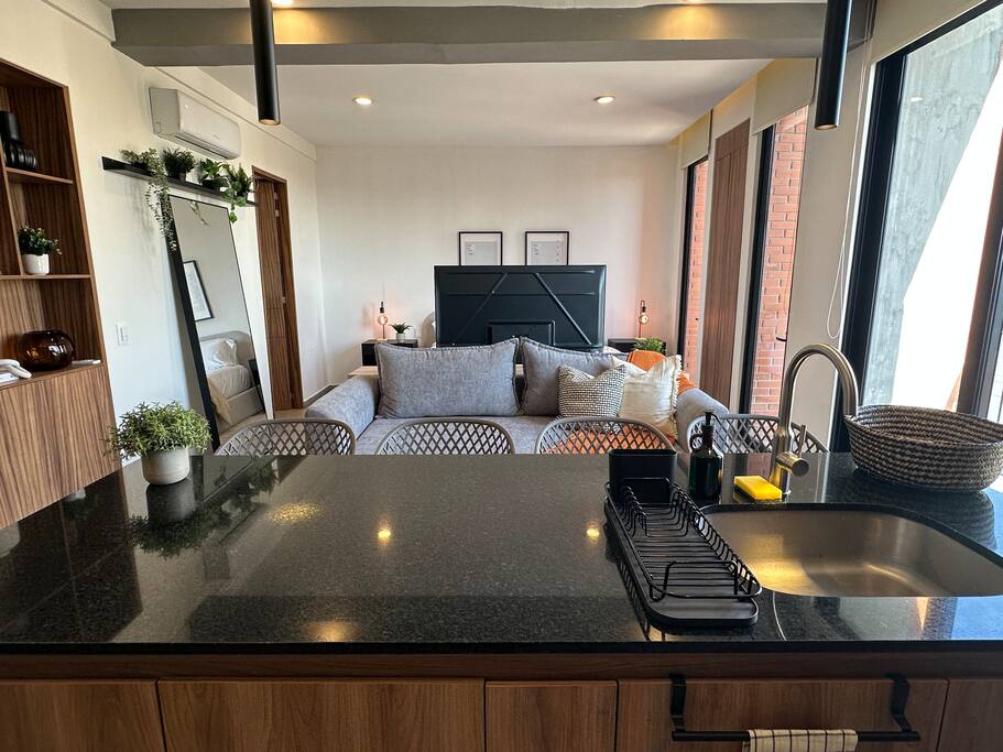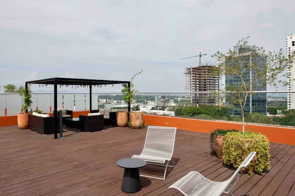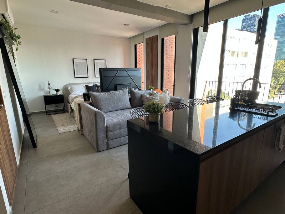 El Espacio: Este loft en el 3er piso destaca por su aprovechamiento de espacio y acabados de lujo, ofreciendo un ambiente acogedor y privado: • Interiorismo: Sala-comedor con aire acondicionado integral y diseño abierto que fluye hacia una cocina equipada con barra de cuarzo. • Descanso: Cama de alta calidad con persianas para total privacidad y un baño moderno con acabados premium. • Funcionalidad: Ideal para estancias largas o viajes de negocios gracias a su distribución inteligente. Amenidades de la Torre: Aunque el loft se encuentra en un piso bajo, tendrás acceso total a las espectaculares áreas comunes en los niveles superiores: • Gimnasio de última generación: Mantente activo sin salir del edificio. • Business Center / Coworking: El lugar perfecto para videollamadas y trabajo concentrado. • Game Room & Terrazas: Espacios diseñados para relajarse y socializar. • Seguridad: Vigilancia 24/7 y acceso controlado. Ubicación Estratégica: Lo mejor de Providencia a pie: • Punto Sao Paulo & Midtown: Los mejores restaurantes, bares y centros comerciales a 5-10 minutos. • Zona Financiera: Ubicación ideal para ejecutivos que visitan los corporativos de Av. Américas. • Bosque Los Colomos: A un par de cuadras para disfrutar de aire puro y caminatas matutinas. ⚠️ Información importante a considerar (Disclaimer): Queremos que tu estancia sea perfecta, por lo que te informamos lo siguiente: • Entorno en Crecimiento: Hay una construcción en el terreno colindante. Es importante mencionar que actualmente no genera niveles de ruido considerables que afecten el descanso, pero preferimos que lo sepas antes de tu llegada.